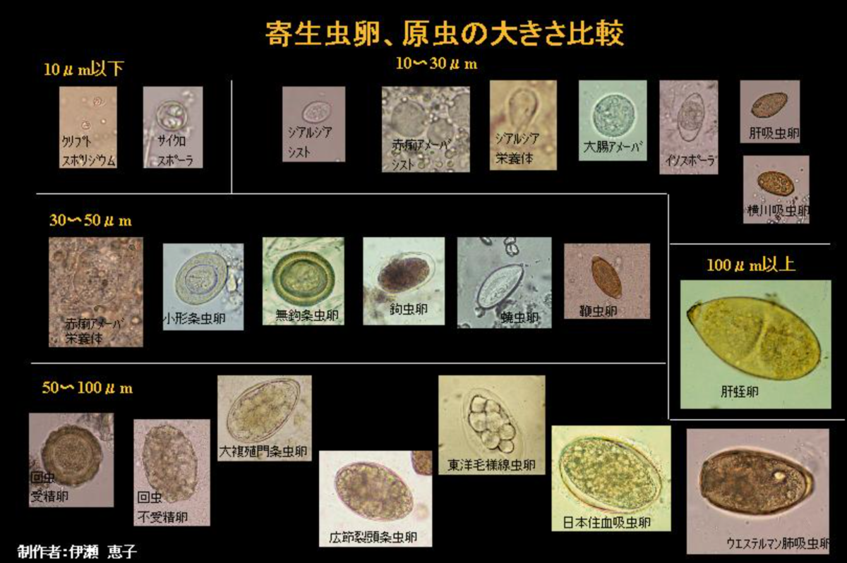 ・浮遊法は、比重の軽い鈎虫卵、東洋毛様線虫卵、回虫不受精卵、鞭虫卵、小型条虫卵、縮小条虫卵、無鉤条虫卵の検出に適している。