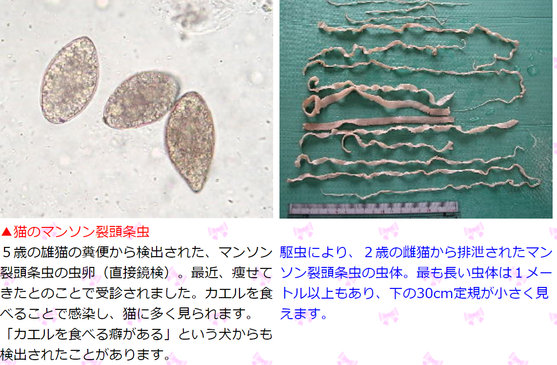 - トキソプラズマ、瓜実条虫、猫条虫、マンソン裂頭条虫